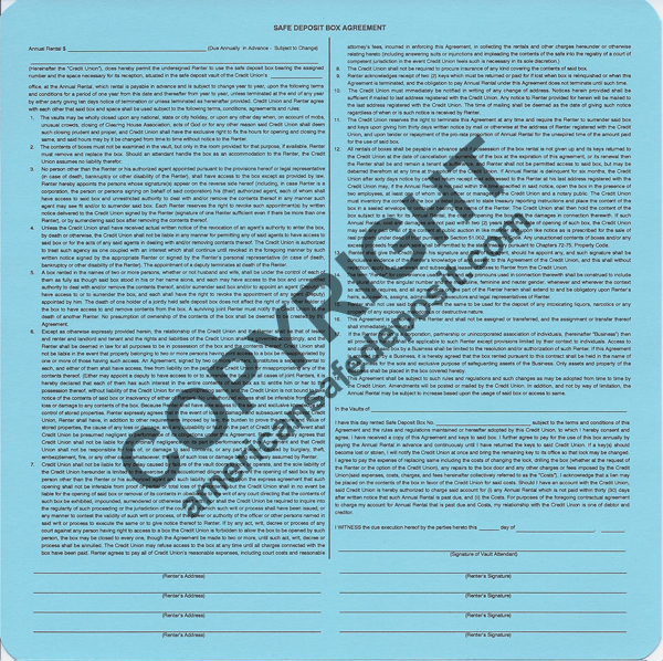 American Deposit Services, Inc. offers a safe deposit contract for your organization in many different varieties. We invite your legal counsel to review our SAFE DEPOSIT AGREEMENT which is an enlargement of our regular contract's legal section. If your legal counsel requests changes to the regulatory section, there are no additional typesetting fees. Other operational or functional changes that are requested can be adapted for a modest typesetting fee. We are sure you have already noted that all of American Deposit Services' materials are copyrighted and may not be reproduced without the expressed written consent of the corporate office.